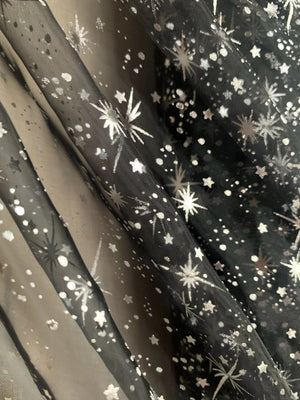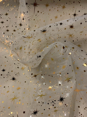 Foil star organza can be used for event decor, fashion, costumes and much more. Examples for ideas are drapery, chair sashes, table runners, bows, dress wear, and backdrops.