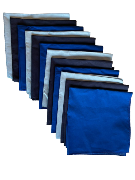 22" x 22" (size and color is estimated can vary by batch) 12 pack consists of 4 royal blue, 4 light blue, and 4 navy bandanas Solid color Hemmed edges Double sided 100% Cotton Made in USA