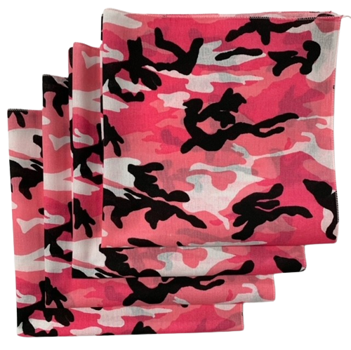 Pink camo bandanas 22" x 22" (estimated size) Rolled-Hem edges Made in USA 4 Pack