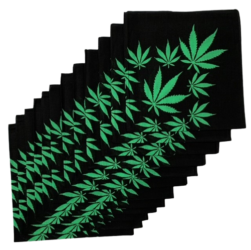 Marijuana Bandanas Green Leaves bandanas sold in a 12 pack. Estimated size is 22" x 22" and is 100% cotton.
