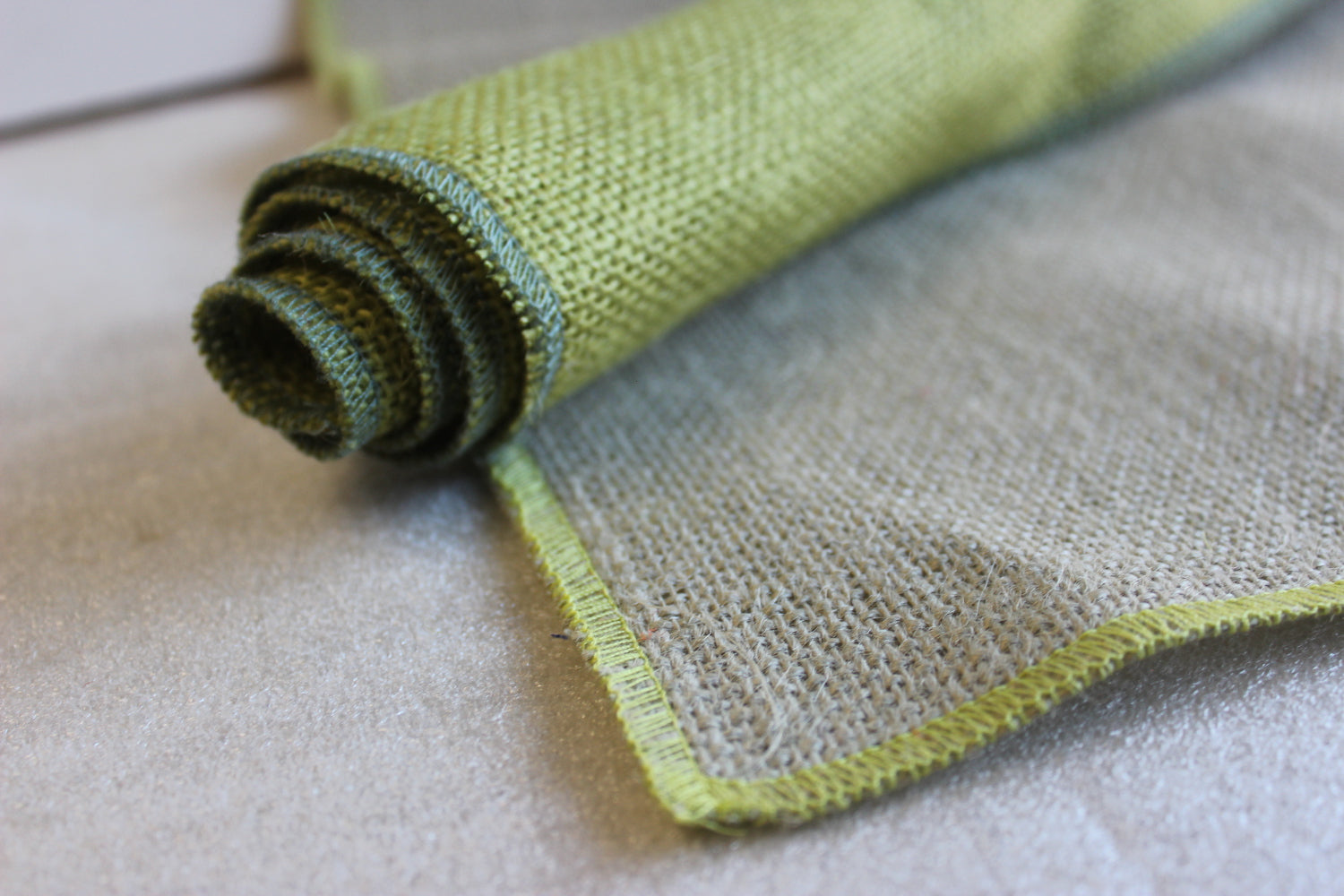 Set of One Sage Table Runner With Avocado edges and Four Contrasting Avocado Napkins with Sage edges. Napkins are 14" x 14". Runner dimension are 14" wide with lengths available in 72", 90", 108", or 120". Custom lengths available upon request.