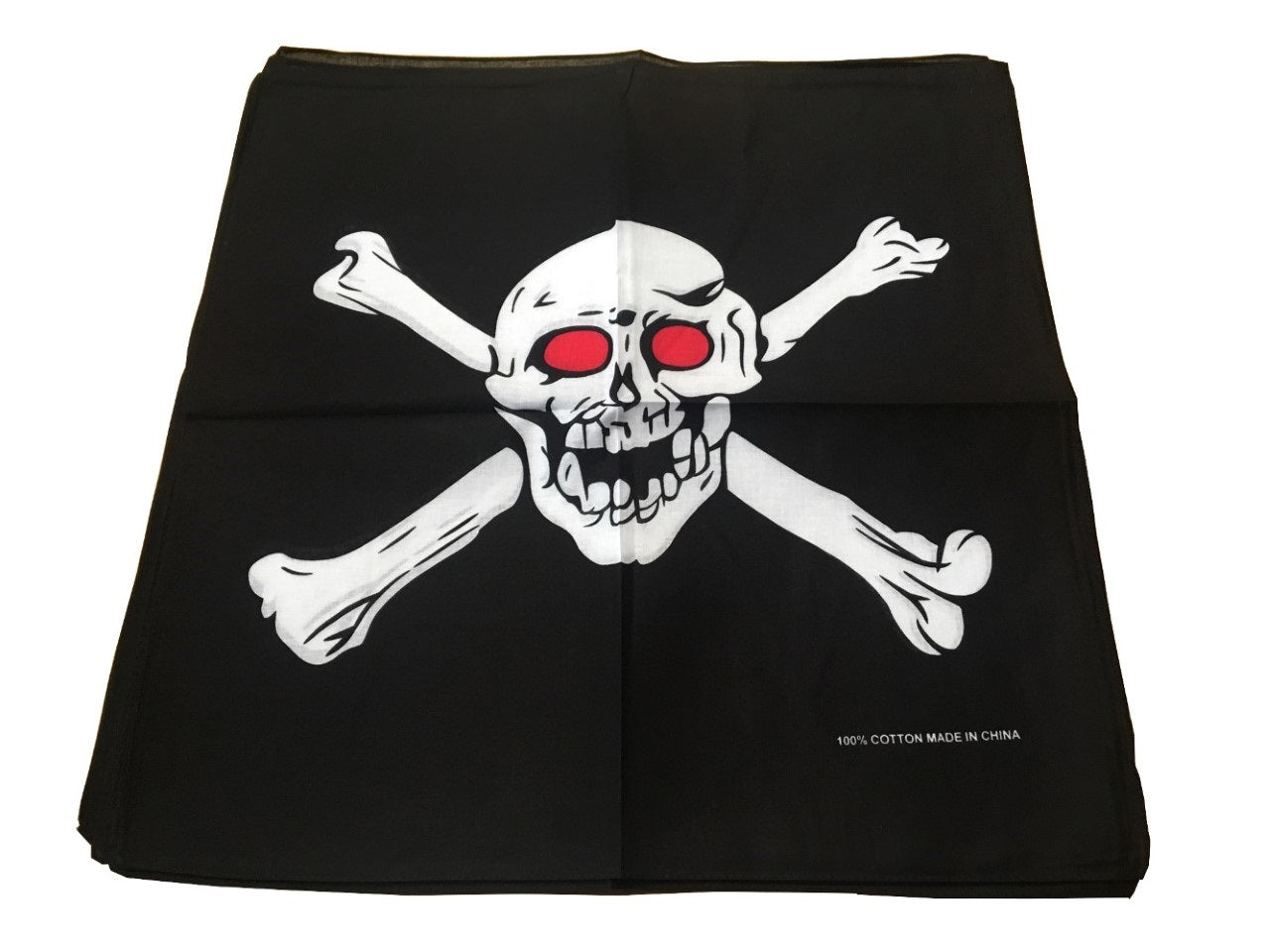 Skull Bandanas design features a large skull with crossbones and red eyes. 22" x 22", 100% cotton, doubled sided, seamed edges and sold in a 6 pack.