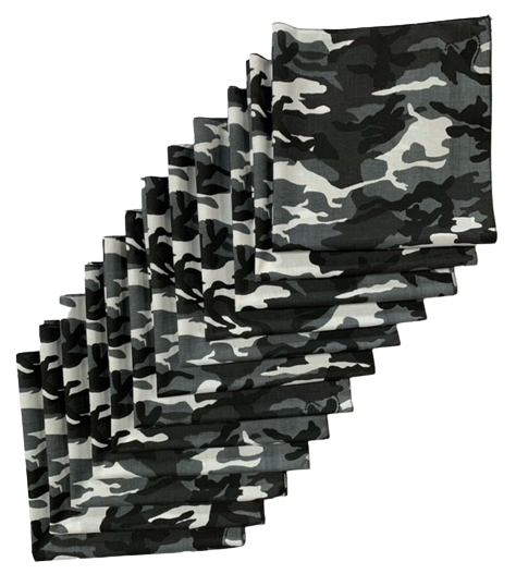 Urban camo bandana 22" x 22" (estimated size) Rolled-Hem edges Made in USA 12 Pack