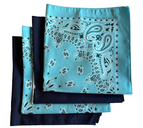 22" x 22" (size and color is estimated can vary by batch) Trademark paisley design consists of 2 light blue paisley print, 2 navy solid bandanas. Matching paisley and solid color bandanas on this listing are not from the same dye lot and color tone will likely differ. (As shown) Rolled hem edges Double sided print on the paisley print bandanas and double sided on the solid color bandanas 100% Cotton Made in USA