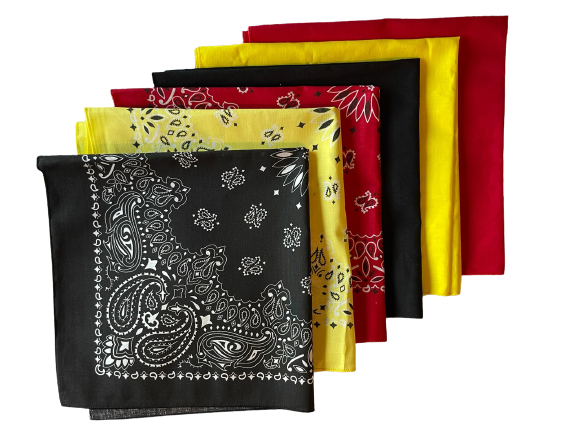 22" x 22" (size and color is estimated can vary by batch) Trademark paisley design consists of 1 black paisley print, 1 yellow paisley print, and 1 red paisley print bandana and 1 sold black, 1 solid yellow, and 1 solid red bandana. Matching paisley and solid color bandanas on this listing are not from the same dye lot and color tone will likely differ. (As shown) Rolled hem edges Double sided print on the paisley print bandanas and double sided on the solid color bandanas 100% Cotton Made in USA