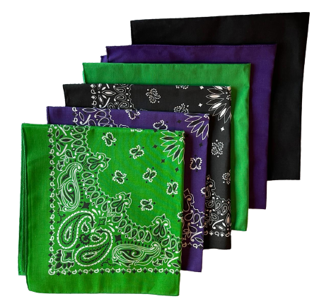 22" x 22" (size and color is estimated can vary by batch) Trademark paisley design consists of 1 green paisley print, 1 purple paisley print, and 1 black paisley print bandana and 1 sold green, 1 solid purple, and 1 solid black bandana. Matching paisley and solid color bandanas on this listing are not from the same dye lot and color tone will likely differ. (As shown) Rolled hem edges Double sided print on the paisley print bandanas and double sided on the solid color bandanas 100% Cotton Made in USA