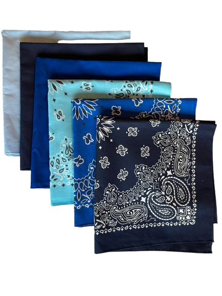 22" x 22" (size and color is estimated can vary by batch) Trademark paisley design consists of 1 light blue paisley print, 1 royal paisley print, and 1 navy paisley print bandana and 1 sold light blue, 1 solid royal blue, and 1 solid navy bandana. Matching paisley and solid color bandanas on this listing are not from the same dye lot and color tone will likely differ. (As shown) Rolled hem edges Double sided print on the paisley print bandanas and double sided on the solid color bandanas 100% Cotton Made in USA