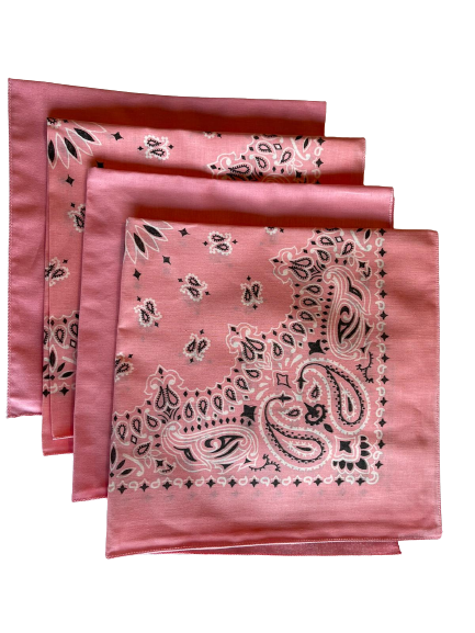 22" x 22" (size and color is estimated can vary by batch) Trademark paisley design consists of 2 pink paisley print bandanas and 2 solid color pink bandanas Matching paisley and solid color pink bandanas are not from the same dye lot and color tone will likely differ Rolled hem edges Double sided print on the paisley print bandanas and double sided on the solid color bandanas 100% Cotton Made in USA