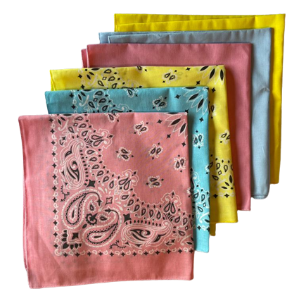 22" x 22" (size and color is estimated can vary by batch) Trademark paisley design consists of 1 pink paisley print, 1 light blue paisley print, and 1 yellow paisley print bandana and 1 sold pink, 1 solid light blue, and 1 solid yellow bandana. Matching paisley and solid color bandanas on this listing are not from the same dye lot and color tone will likely differ. (As shown) Rolled hem edges Double sided print on the paisley print bandanas and double sided on the solid color bandanas 100% Cotton Made in USA