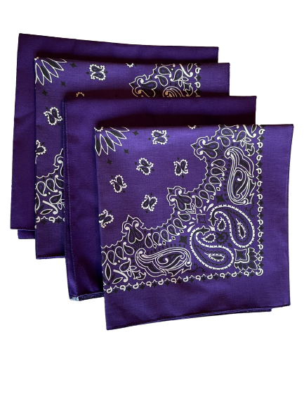 22" x 22" (size and color is estimated can vary by batch) Trademark paisley design consists of 2 purple paisley print bandanas and 2 solid color purple bandanas Matching paisley and solid color purple bandanas are not from the same dye lot and color tone will likely differ. (As shown) Rolled hem edges Double sided print on the paisley print bandanas and double sided on the solid color bandanas 100% Cotton Made in USA