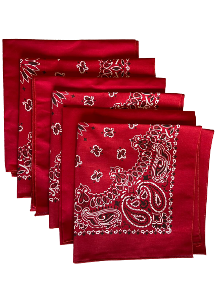 22" x 22" (size and color is estimated can vary by batch) Trademark paisley design consists of 3 red paisley print bandanas and 3 solid color red bandanas Matching paisley and solid color red bandanas are not from the same dye lot and color tone will likely differ Rolled hem edges Double sided print on the paisley print bandanas and double sided on the solid color bandanas 100% Cotton Made in USA