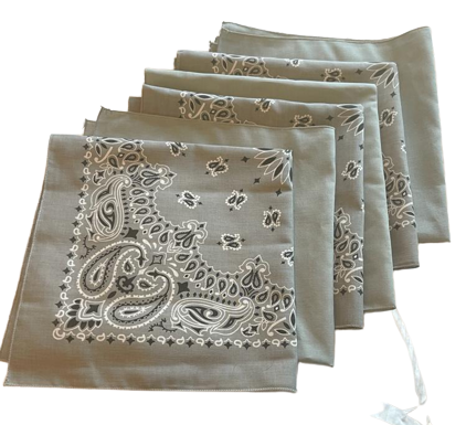 22" x 22" (size and color is estimated can vary by batch) Trademark paisley design consists of 3 silver paisley print bandanas and 3 solid color silver bandanas Matching paisley and solid color silver bandanas are not from the same dye lot and color tone will likely differ. (As shown) Rolled hem edges Double sided print on the paisley print bandanas and double sided on the solid color bandanas 100% Cotton Made in USA