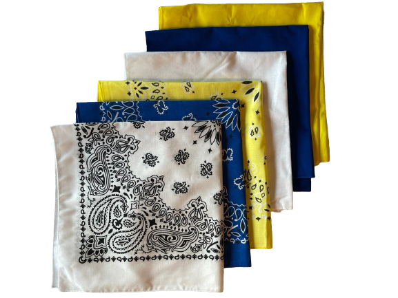 22" x 22" (size and color is estimated can vary by batch) Trademark paisley design consists of 1 white paisley print, 1 blue paisley print, and 1 yellow paisley print bandana and 1 sold white, 1 solid blue, and 1 solid yellow bandana. Matching paisley and solid color bandanas on this listing are not from the same dye lot and color tone will likely differ. (As shown) Rolled hem edges Double sided print on the paisley print bandanas and double sided on the solid color bandanas 100% Cotton Made in USA
