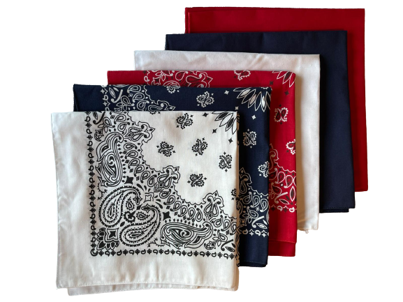 22" x 22" (size and color is estimated can vary by batch) Trademark paisley design consists of 1 white paisley print, 1 navy paisley print, and 1 red paisley print bandana and 1 sold white, 1 solid navy, and 1 solid red bandana. Matching paisley and solid color bandanas on this listing are not from the same dye lot and color tone will likely differ. (As shown) Rolled hem edges Double sided print on the paisley print bandanas and double sided on the solid color bandanas 100% Cotton Made in USA