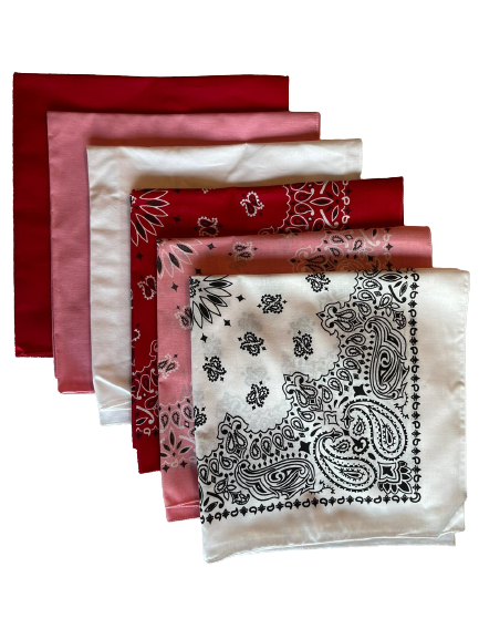 22" x 22" (size and color is estimated can vary by batch) Trademark paisley design consists of 1 white paisley print, 1 pink paisley print, and 1 red paisley print bandana and 1 sold white, 1 solid pink, and 1 solid red bandana. Matching paisley and solid color bandanas on this listing are not from the same dye lot and color tone will likely differ. (As shown) Rolled hem edges Double sided print on the paisley print bandanas and double sided on the solid color bandanas 100% Cotton Made in USA