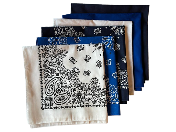 22" x 22" (size and color is estimated can vary by batch) Trademark paisley design consists of 1 white paisley print, 1 royal blue paisley print, and 1 navy paisley print bandana and 1 sold white, 1 solid royal blue and 1 solid navy bandana. Matching paisley and solid color bandanas on this listing are not from the same dye lot and color tone will likely differ. (As shown) Rolled hem edges Double sided print on the paisley print bandanas and double sided on the solid color bandanas 100% Cotton Made in USA