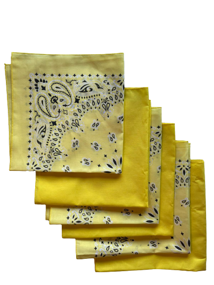 22" x 22" (size and color is estimated can vary by batch) Trademark paisley design consists of 3 yellow paisley print bandanas and 3 solid color yellow bandanas Matching paisley and solid color yellow bandanas are not from the same dye lot and color tone will likely differ. (As shown) Rolled hem edges Double sided print on the paisley print bandanas and double sided on the solid color bandanas 100% Cotton Made in USA
