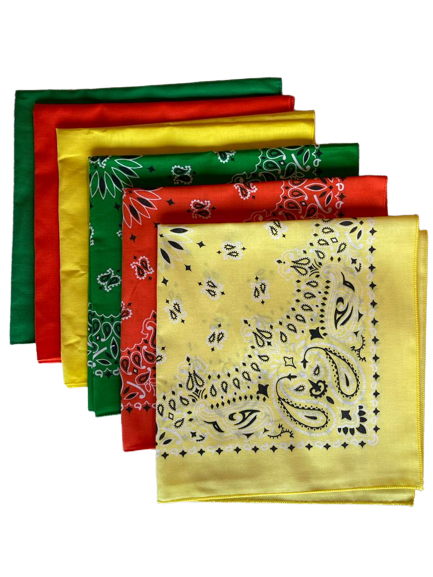 22" x 22" (size and color is estimated can vary by batch) Trademark paisley design consists of 1 yellow paisley print, 1 orange paisley print, and 1 green paisley print bandana and 1 sold yellow, 1 solid orange, and 1 solid green bandana. Matching paisley and solid color bandanas on this listing are not from the same dye lot and color tone will likely differ. (As shown) Rolled hem edges Double sided print on the paisley print bandanas and double sided on the solid color bandanas 100% Cotton Made in USA