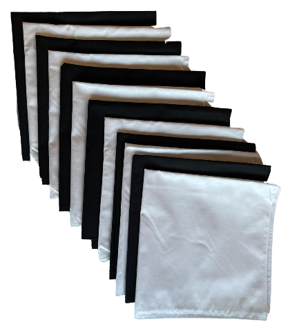 22" x 22" (size and color is estimated can vary by batch) 12 pack consists of 6 black, 6 white Solid color Hemmed edges Double sided 100% Cotton Made in USA