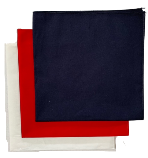 USA made premium quality 100% cotton solid color bandanas offered in an estimated size of 22" x 22" size doubled sided with seamed edges. Sold in a 3 pack consisting of white, red, and navy.