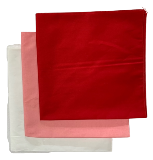 USA made premium quality 100% cotton solid color bandanas offered in an estimated size of 22" x 22" size doubled sided with seamed edges. Sold in a 3 pack consisting of white, red, and pink.
