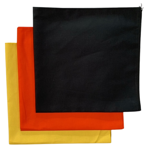 USA made premium quality 100% cotton solid color bandanas offered in an estimated size of 22" x 22" size doubled sided with seamed edges. Sold in a 3 pack consisting of yellow, orange, and black.